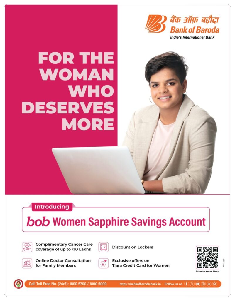 Further, bob Women Sapphire Savings accountholders will benefit from discounted locker charges, a 50% waiver on home loan processing charges, along with a wide range of other banking privileges.