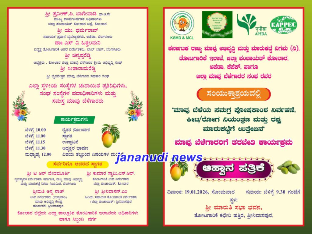 ಶ್ರೀನಿವಾಸಪುರ: ಕೋಲಾರ ಜಿಲ್ಲೆಯ ಶ್ರೀನಿವಾಸಪುರ ತಾಲೂಕಿನ ಮಾವು ಬೆಳೆಗಾರರಿಗೆ ಉಪಯುಕ್ತವಾಗುವಂತೆ ಮಾವು ಬೆಳೆಯ ಸಮಗ್ರ ಪೋಷಕಾಂಶ ನಿರ್ವಹಣೆ, ಕೀಟ, ರೋಗ ನಿಯಂತ್ರಣ ಹಾಗೂ ರಫ್ತು ಮಾರುಕಟ್ಟೆ ಉತ್ತೇಜನ ಕುರಿತ ವಿಶೇಷ ತರಬೇತಿ ಕಾರ್ಯಕ್ರಮವನ್ನು ಜನವರಿ 19, 2026 (ಸೋಮವಾರ) ರಂದು ಹಮ್ಮಿಕೊಳ್ಳಲಾಗಿದೆ.