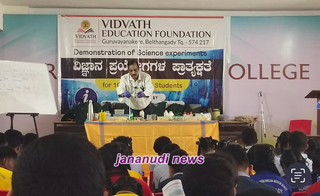 ಗುರುವಾಯನಕೆರೆ; ವಿದ್ವತ್ ಪಿಯು ಕಾಲೇಜು ಗುರುವಾಯನಕೆರೆ, ಇದರ ಇನ್ಸ್ಪೈರ್ ವಿದ್ವತ್ ಸೈನ್ಸ್ ಫೋರಂ ಇದರ ಆಶ್ರಯದಲ್ಲಿ ಆಯೋಜಿಸಿದ ಹತ್ತನೇ ತರಗತಿಯ ಪಠ್ಯಪುಸ್ತಕದಲ್ಲಿ ಎನ್ ಸಿ ಇ ಆರ್ ಟಿ ಮಾರ್ಗಸೂಚಿಯ ಪ್ರಕಾರ ನೀಡಿದ ” ವಿಜ್ಞಾನ ಪ್ರಯೋಗಗಳ ಪ್ರಾತ್ಯಕ್ಷತೆ ” ಕಾರ್ಯಕ್ರಮವು ಯಶಸ್ವಿಯಾಗಿ ನಡೆಯಿತು. ಈ ಕಾರ್ಯಕ್ರಮದಲ್ಲಿ ಬೆಳ್ತಂಗಡಿ ತಾಲೂಕಿನ ವಿವಿಧ ಶಾಲೆಗಳಿಂದ ವಿದ್ಯಾರ್ಥಿ ವಿದ್ಯಾರ್ಥಿನಿಯರು ಭಾಗವಹಿಸಿ ಕಾರ್ಯಕ್ರಮದ ಪ್ರಯೋಜನವನ್ನು ಪಡೆದುಕೊಂಡರು. ಕಾರ್ಯಕ್ರಮದ ಸಂಪನ್ಮೂಲ ವ್ಯಕ್ತಿಯಾಗಿ, ನಿವೃತ್ತ ಪ್ರಾಂಶುಪಾಲ ಹಾಗೂ ಶಿಕ್ಷಣ ತಜ್ಞ ಶ್ರೀಯುತ ಪಾರ್ಥಸಾರಥಿಯವರು ಭಾಗವಹಿಸಿದ್ದರು.