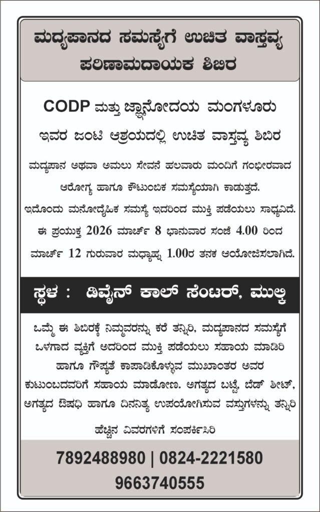 ಒಮ್ಮೆ ಈ ಶಿಬಿರಕ್ಕೆ ನಿಮ್ಮವರನ್ನು ಕರೆ ತನ್ನಿರಿ, ಮದ್ಯಪಾನದ ಸಮಸ್ಯೆಗೆ ಒಳಗಾದ ವ್ಯಕ್ತಿಗೆ ಅದರಿ೦ದ ಮುಕ್ತಿ ಪಡೆಯಲು ಸಹಾಯ ಮಾಡಿರಿ.