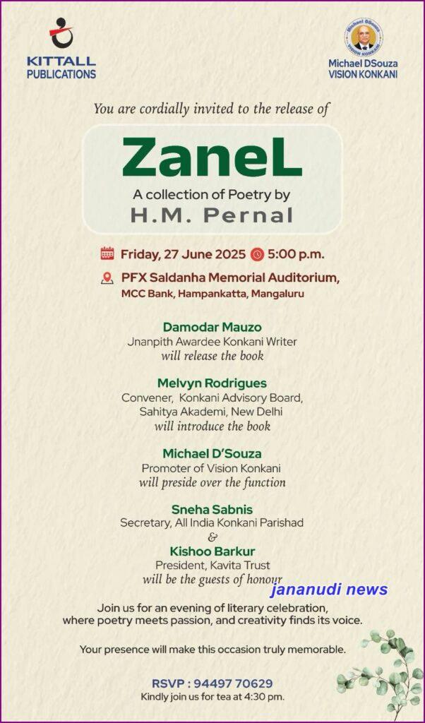 ಜೂನ್ 27 ರಂದು ಎಚ್. ಎಮ್. ಪೆರ್ನಾಲ್ “ಜನೆಲ್” ಕೊಂಕಣಿ ಕವನ ಸಂಕಲನ ಬಿಡುಗಡೆ