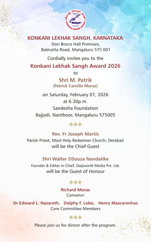 2026ನೇ ಸಾಲಿನ ಕೊಂಕಣಿ ಲೇಖಕ್ ಸಂಘ್ ಸಾಹಿತ್ಯ ಪ್ರಶಸ್ತಿಗೆ ಖ್ಯಾತ ಕೊಂಕಣಿ ಲೇಖಕ ಶ್ರೀ ಪೆಟ್ರಿಕ್ ಕಾಮಿಲ್ ಮೊರಾಸ್ (ಎಮ್. ಪೆಟ್ರಿಕ್) ಇವರನ್ನು ಆಯ್ಕೆ ಮಾಡಲಾಗಿದೆ.
