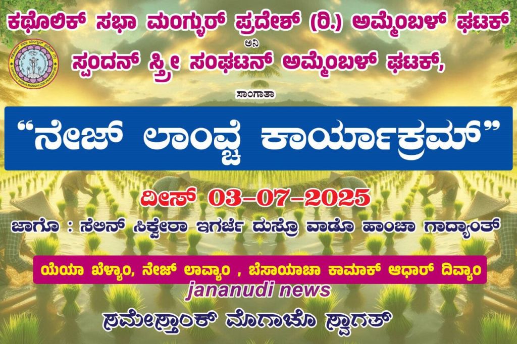 ಅಮ್ಮೆಂಬಳ; ಕಥೊಲಿಕ್ ಸಭಾ ,ಅಮ್ಮೆಂಬಳ ಘಟಕ ಹಾಗೂ ಸ್ಪಂದನಾ ಸ್ತ್ರೀ ಸಂಘಟನೆ ಅಮ್ಮೆಂಬಳ ಘಟಕ ಗಳ ಜಂಟಿ ಆಶ್ರಯದಲ್ಲಿ ನೇಜಿ ನೆಡುವ ಕಾರ್ಯಕ್ರಮ ದಿನಾಂಕ 3/07/2025 ರಂದು ಚೇಳೂರಿನ ಶ್ರೀಮತಿ ಸೆಲಿನ್ ಸಿಕ್ವೇರಾ ರವರ ಗದ್ದೆಯಲ್ಲಿ ನಡೆಸಲಾಯಿತು. ಪ್ರಾರ್ಥನೆಯೊಂದಿಗೆ ಆರಂಭವಾದ ಕಾರ್ಯಕ್ರಮಕ್ಕೆ ಆಗಮಿಸಿದ ಸರ್ವರನ್ನೂ ಕಥೊಲಿಕ್ ಸಭಾ ಘಟಕದ ಅಧ್ಯಕ್ಷ ಆಲ್ಬರ್ಟ್ ಡಿ ಸೋಜಾರವರು ಸ್ವಾಗತಿಸಿದರು.