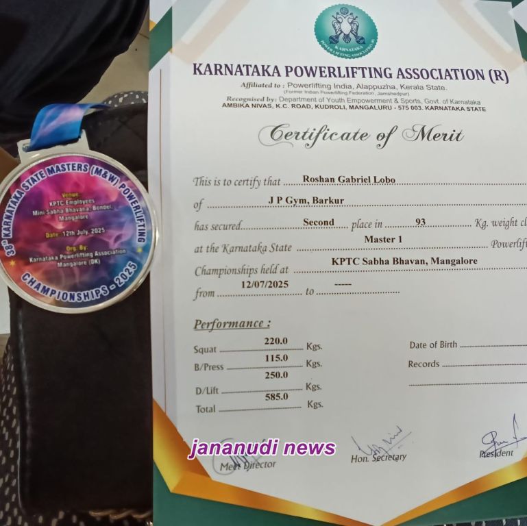 ಮಂಗಳೂರು, ಜುಲೈ 12, 2025 — ಮಂಗಳೂರಿನ ಕೆಪಿಟಿಸಿ ಸಭಾ ಭವನದಲ್ಲಿ ಇಂದು ನಡೆದ ಕರ್ನಾಟಕ ರಾಜ್ಯ ಮಟ್ಟದ ಪವರ್ಲಿಫ್ಟಿಂಗ್ ಸ್ಪರ್ಧೆಯಲ್ಲಿ ಹೊಸಳ ಬಾರ್ಕೂರಿನ ರೋಶನ್ ಲೋಬೊ ಬೆಳ್ಳಿ ಪದಕ ಗೆದ್ದರು, ಇದು ಅವರ ಪ್ರಭಾವಶಾಲಿ ಸಂಗ್ರಹಕ್ಕೆ ಮತ್ತೊಂದು ಗೌರವವನ್ನು ಸೇರಿಸಿತು.
