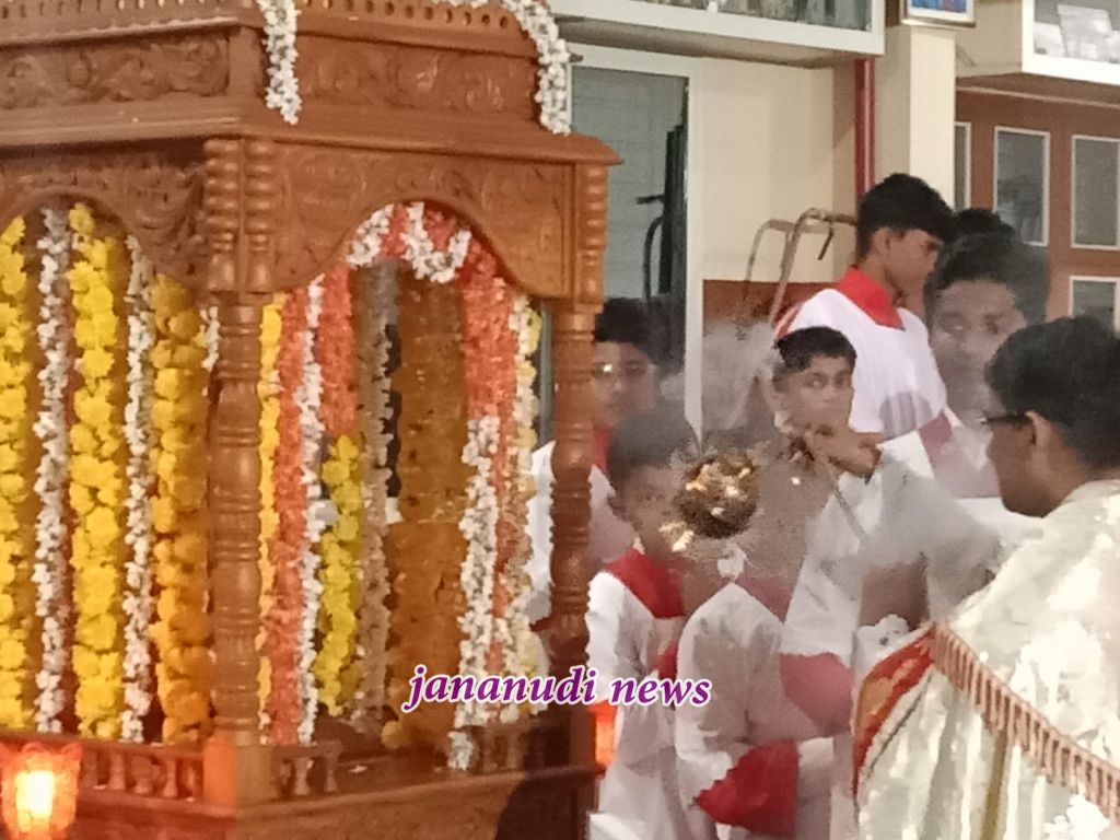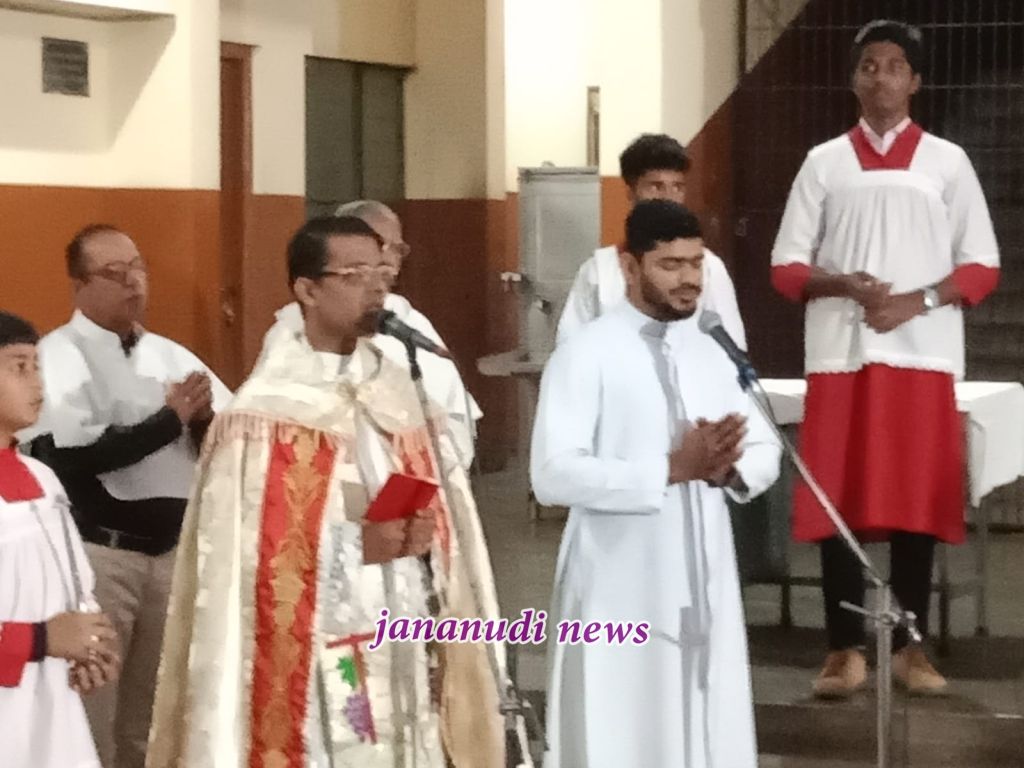 At sharp 6.45 p.m., the main celebrant of the liturgy, Rev. Fr Jithesh Castelino, Director of the Diocesan ‘Commission for the Holy Bible and Faith Formation’, solemnly entered the beautifully adorned High Altar along with priests from the Deanery, native priests, and guest priests.