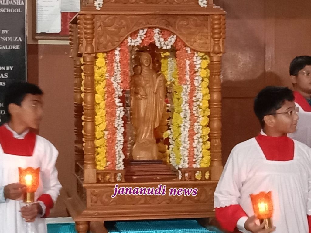 ಸಂಜೆಯ ಮಹತ್ವದ ಮತ್ತು ಸ್ಪರ್ಶದ ಕ್ಷಣವೆಂದರೆ ಪ್ಯಾರಿಷ್ನ ಪ್ರೀತಿಯ ಪೋಷಕಿ ‘ಅವರ್ ಲೇಡಿ ಆಫ್ ದಿ ಹೋಲಿ ರೋಸರಿ’ಯನ್ನು ಪಲ್ಲಕ್ಕಿಯಲ್ಲಿ ಇರಿಸಿದ್ದ ಪುತ್ಥಳಿಯನ್ನು ಮೌಂಟ್ ರೋಸರಿ ಇಂಗ್ಲಿಷ್ ಮೀಡಿಯಂ ಹೈಸ್ಕೂಲ್ ವೆರಾಂಡಾದಲ್ಲಿ ಆಶೀರ್ವದಿಸಲಾಯಿತು ಮತ್ತು ಸುಮಧುರ ಹಿತ್ತಾಳೆ ಬ್ಯಾಂಡ್ ನೇತೃತ್ವದಲ್ಲಿ ಚರ್ಚ್ಗೆ ಮೆರವಣಿಗೆಯಲ್ಲಿ ತರಲಾಯಿತು, ಅಲ್ಲಿ ಅದನ್ನು ಸುಂದರವಾಗಿ ಅಲಂಕರಿಸಿದ ಪೆಂಡಲ್ನಲ್ಲಿ ಇರಿಸಲಾಯಿತು.