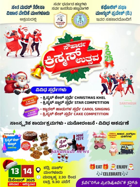 ಮಂಗಳೂರು, ಡಿಸೆಂಬರ್ 2025: ಸಂತ ಮದರ್ ತೆರೆಸಾ ವಿಚಾರ ವೇದಿಕೆ, ಮಂಗಳೂರು ಮತ್ತು ಕಥೊಲಿಕ್ ಸಭಾ ಮಂಗ್ಳುರ್ ಪ್ರದೇಶ್ (ರಿ.) ಸಂಯುಕ್ತ ಆಶ್ರಯದಲ್ಲಿ, ಅತ್ಯಂತ ನಿರೀಕ್ಷಿತ “ಸೌಹಾರ್ದ ಕ್ರಿಸ್ಮಸ್ ಉತ್ಸವ 2025” ವನ್ನು ಘೋಷಿಸಲು ಸಂತೋಷಪಡುತ್ತೇವೆ. ಕ್ರಿಸ್ಮಸ್ ಹಬ್ಬದ ನಿಜವಾದ ಸಂದೇಶವಾದ ಶಾಂತಿ, ಸೌಹಾರ್ದ ಮತ್ತು ಸಹಭಾಗಿತ್ವವನ್ನು ಉತ್ತೇಜಿಸುವ ಈ ಸಂಭ್ರಮಭರಿತ ಉತ್ಸವ ಡಿಸೆಂಬರ್ 13 ಮತ್ತು 14, 2025 ರಂದು, ಮಂಗಳೂರು ಕದ್ರಿ ಪಾರ್ಕ್ನಲ್ಲಿ, ಮಧ್ಯಾಹ್ನ 2:30ರಿಂದ ರಾತ್ರಿ 9:30ರವರೆಗೆ ನಡೆಯಲಿದೆ.
