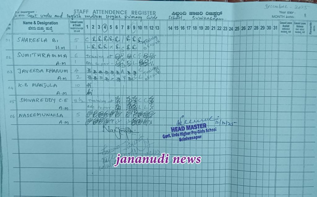 ಶಾಲೆಯ ಒಬ್ಬ ಶಿಕ್ಷಕಿ ಡಿಸೆಂಬರ್ 2ರಿಂದ 12ರವರೆಗೆ ನಿರಂತರವಾಗಿ ಗೈರು ಹಾಜರಾಗಿದ್ದರೂ, ಈ ಅವಧಿಯಲ್ಲೇ ಕ್ಷೇತ್ರ ಶಿಕ್ಷಣಾಧಿಕಾರಿಗಳು ಶಾಲೆಗೆ ಭೇಟಿ ನೀಡಿ ಡಿಸೆಂಬರ್ 10ರಂದು ಹಾಜರಾತಿ ಪುಸ್ತಕವನ್ನು ಪರಿಶೀಲಿಸಿರುವುದು ಮಾಹಿತಿ ಹಕ್ಕು ಕಾಯ್ದೆ–2005ರಡಿ ಸಲ್ಲಿಸಲಾದ ಅರ್ಜಿಯಿಂದ ಬಹಿರಂಗವಾಗಿದೆ. ಶಬ್ಬೀರ್ ಅಹ್ಮದ್ ಅವರು ಸಲ್ಲಿಸಿದ ಮಾಹಿತಿ ಹಕ್ಕು ಅರ್ಜಿಗೆ ಲಭ್ಯವಾದ ದಾಖಲೆಗಳ ಪ್ರಕಾರ, ಪರಿಶೀಲನೆಯ ವೇಳೆ ಗೈರಾಗಿದ್ದ ಶಿಕ್ಷಕಿಯ ಹೆಸರಿನ ಎದುರು ಗೈರು ಗುರುತು ದಾಖಲಿಸದೇ, ಅದರ ಕೆಳಭಾಗದಲ್ಲಿ ಕ್ಷೇತ್ರ ಶಿಕ್ಷಣಾಧಿಕಾರಿಗಳು ತಮ್ಮ ಸಹಿ ಹಾಗೂ ದಿನಾಂಕವನ್ನು ನಮೂದಿಸಿರುವುದು ಹಲವು ಪ್ರಶ್ನೆಗಳನ್ನು ಹುಟ್ಟುಹಾಕಿದೆ.