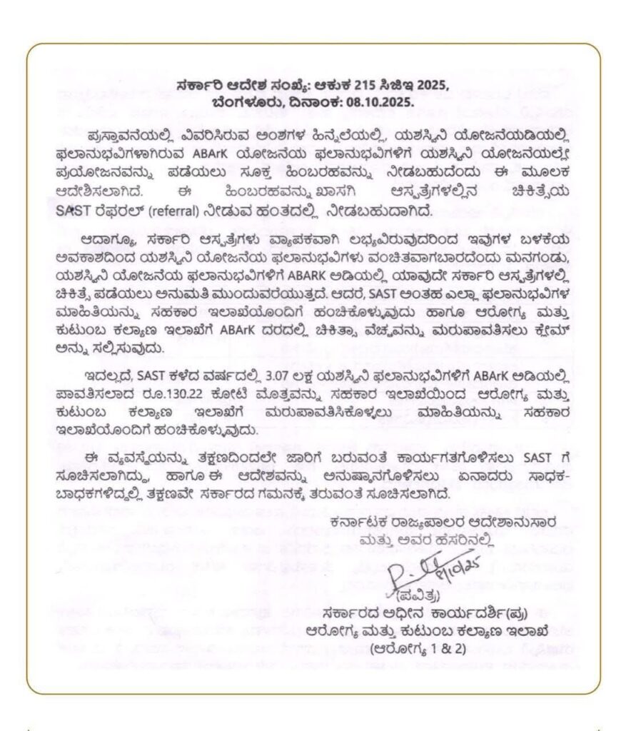 ಬೆಂಗಳೂರು : ರಾಜ್ಯ ಸರ್ಕಾರವು ಯಶಸ್ವಿನಿ ಯೋಜನೆಯ ಫಲಾನುಭವಿಗಳಿಗೆ ಆರೋಗ್ಯ ಸೇವೆಗಳ ಹಿಂಬರಹದ ಕುರಿತು ಮಹತ್ವದ ಆದೇಶವನ್ನು ಹೊರಡಿಸಿದೆ. ಸರ್ಕಾರಿ ಆದೇಶ ಸಂಖ್ಯೆ: ಆಕುಕ 215 ಸಿಜಿಇ 2025, ದಿನಾಂಕ 08.10.2025ರಂತೆ, ಯಶಸ್ವಿನಿ ಯೋಜನೆಯಡಿಯಲ್ಲಿ ಫಲಾನುಭವಿಗಳಾಗಿರುವ ABArK ಯೋಜನೆಯ ಲಾಭಾರ್ಥಿಗಳಿಗೆ ಯಶಸ್ವಿನಿ ಯೋಜನೆಯಲ್ಲೇ ಪ್ರಯೋಜನ ಪಡೆಯಲು ಸೂಕ್ತ ಹಿಂಬರಹವನ್ನು ನೀಡಲು ಸರ್ಕಾರ ಅನುಮೋದನೆ ನೀಡಿದೆ.