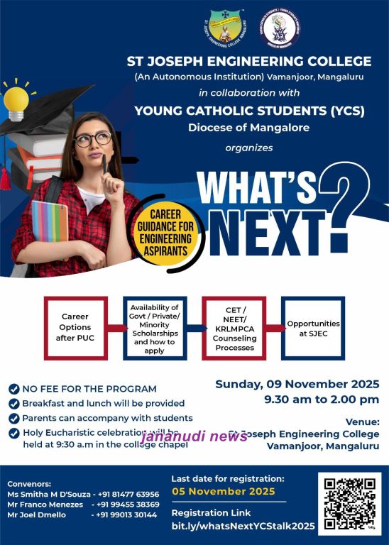 Mangaluru, 9 November 2025: Young Catholic Students (YCS), Diocese of Mangalore, in collaboration with St Joseph Engineering College (SJEC), Vamanjoor, organised ‘What’s Next?’—a comprehensive career guidance programme aimed at II PUC students aspiring to pursue engineering. The initiative sought to equip young learners with clarity on various academic pathways, scholarship opportunities, and entrance examinations.